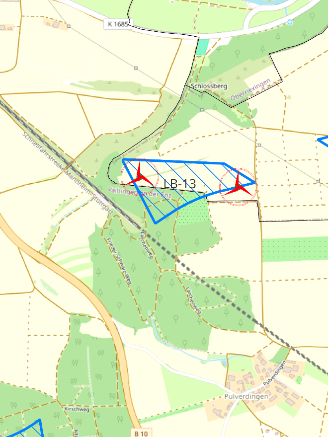 Im Windvorranggebiet LB 13, ebenfalls auf Markgröninger Gemarkung nahe Pulverdingen, planen wir einen Windpark mit 2 Anlagen Typ Enercon E175-EP5. Auch hier läuft das Genehmigungsverfahren und wir rechnen in ca. 3 Jahren mit der Inbetriebnahme der Anlagen.
