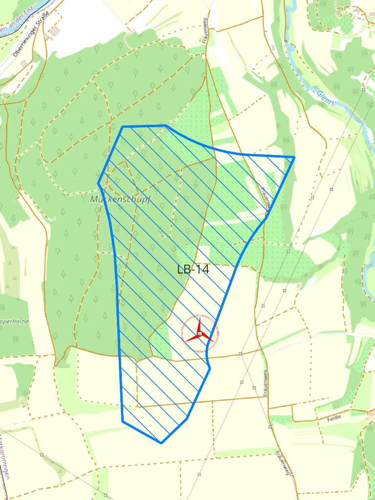 Im Windvorranggebiet LB 14 planen wir aktuell auf der Gemarkung Markgröningen, nähe Muckenschupf, einen Windpark mit 1-2 Anlagen vom Typ Enercon E175-EP5 (7 MW, 175m Rotordurchmesser und 175m Nabenhöhe). Das Antragsverfahren läuft, nach Genehmigungserteilung können wir voraussichtlich in 2-3 Jahren die Anlagen in Betrieb nehmen.